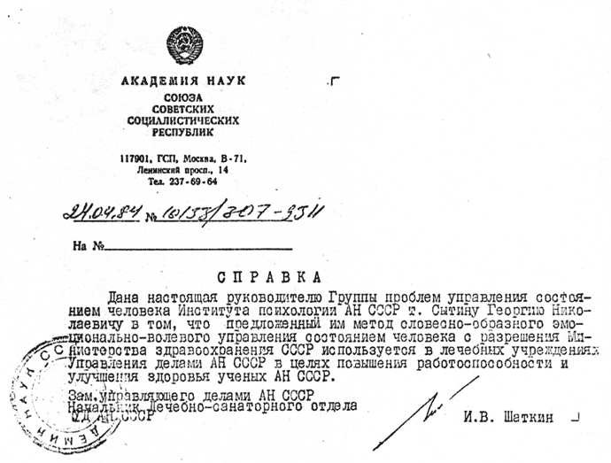 Справка об использовании метода Сытина в лечебных учреждениях АН для повышения работоспособности и улучшения здоровья ученых АН СССР